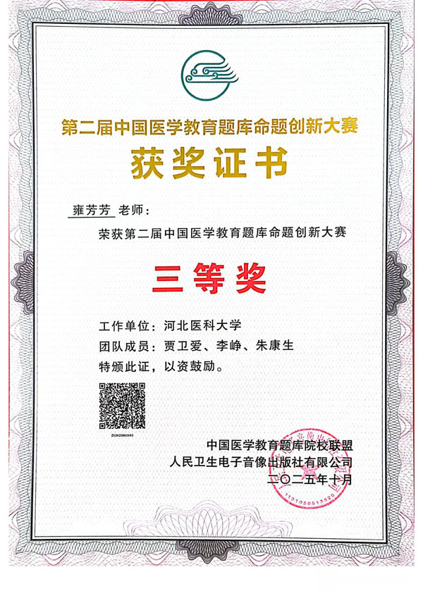 10月19-21日,由中国医学教育题库院校联盟、人民卫生电子音像出版社联合主办,中国医科大学承办的第二届中国医学教育题库命题创新大赛在北京举行。我院麻醉教研室教师团队首次代表学校参赛,历经层层选拔,最终荣获全国三等奖,展现了我院在医学教育教学改革领域的扎实功底与创新实力。